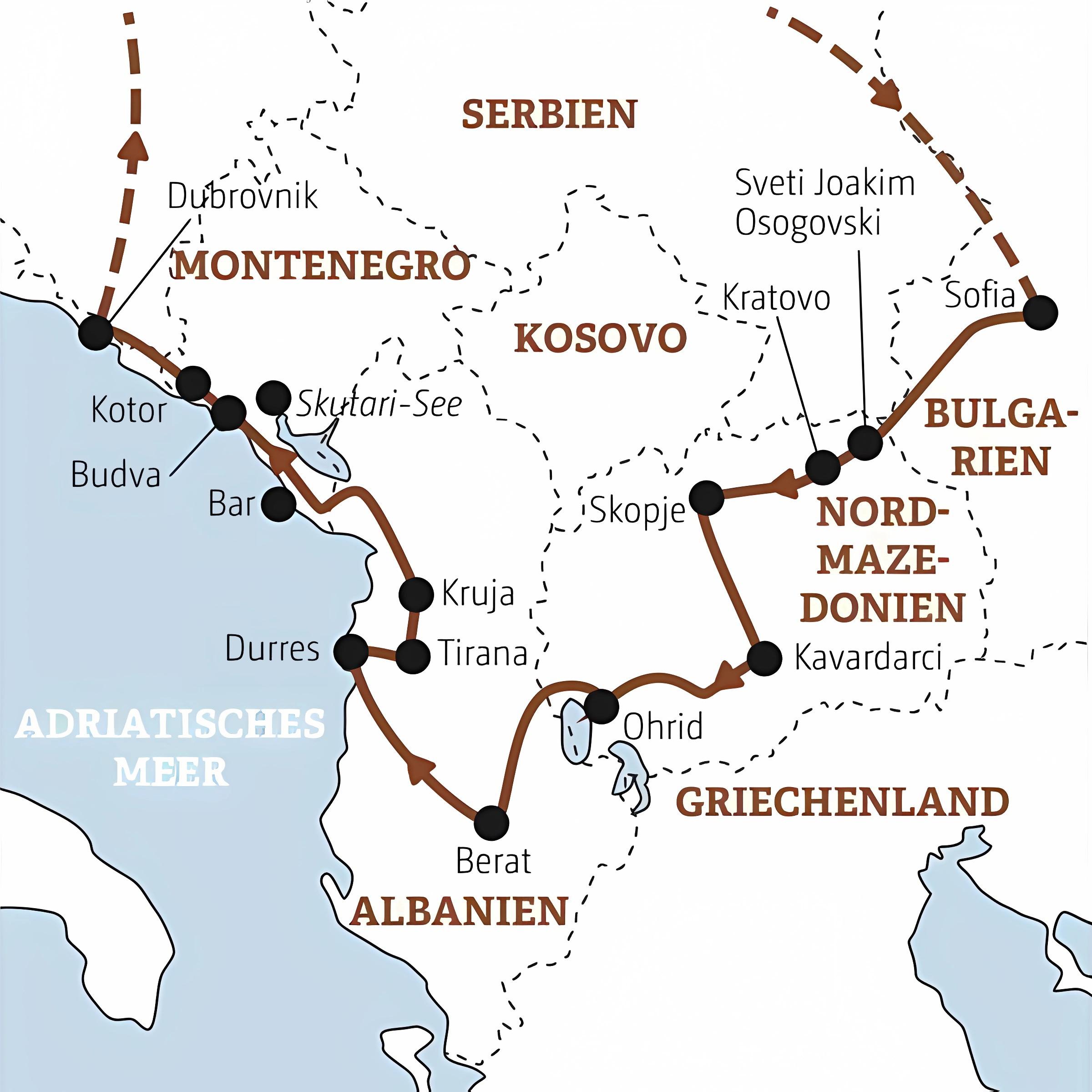 Vormittags erkunden Sie die albanische Hauptstadt Tirana. Eine Stadt im Umbruch und Aufbruch: Düstere sozialistische Fassaden der Hodscha-Zeit werden mit bunten Farben aufgelockert, schicke Bars liegen neben urigen Basaren. Warum Fürst Skanderbeg als Nationalheld verehrt wird, erfahren Sie im Bergstädtchen Kruja. Grenzwechsel: Am Nachmittag geht die Reise weiter nach Budva in Montenegro. Die Stadt liegt auf einer kleinen Halbinsel und wurde sowohl von Venezianern als auch Habsburgern regiert. Drei Übernachtungen.