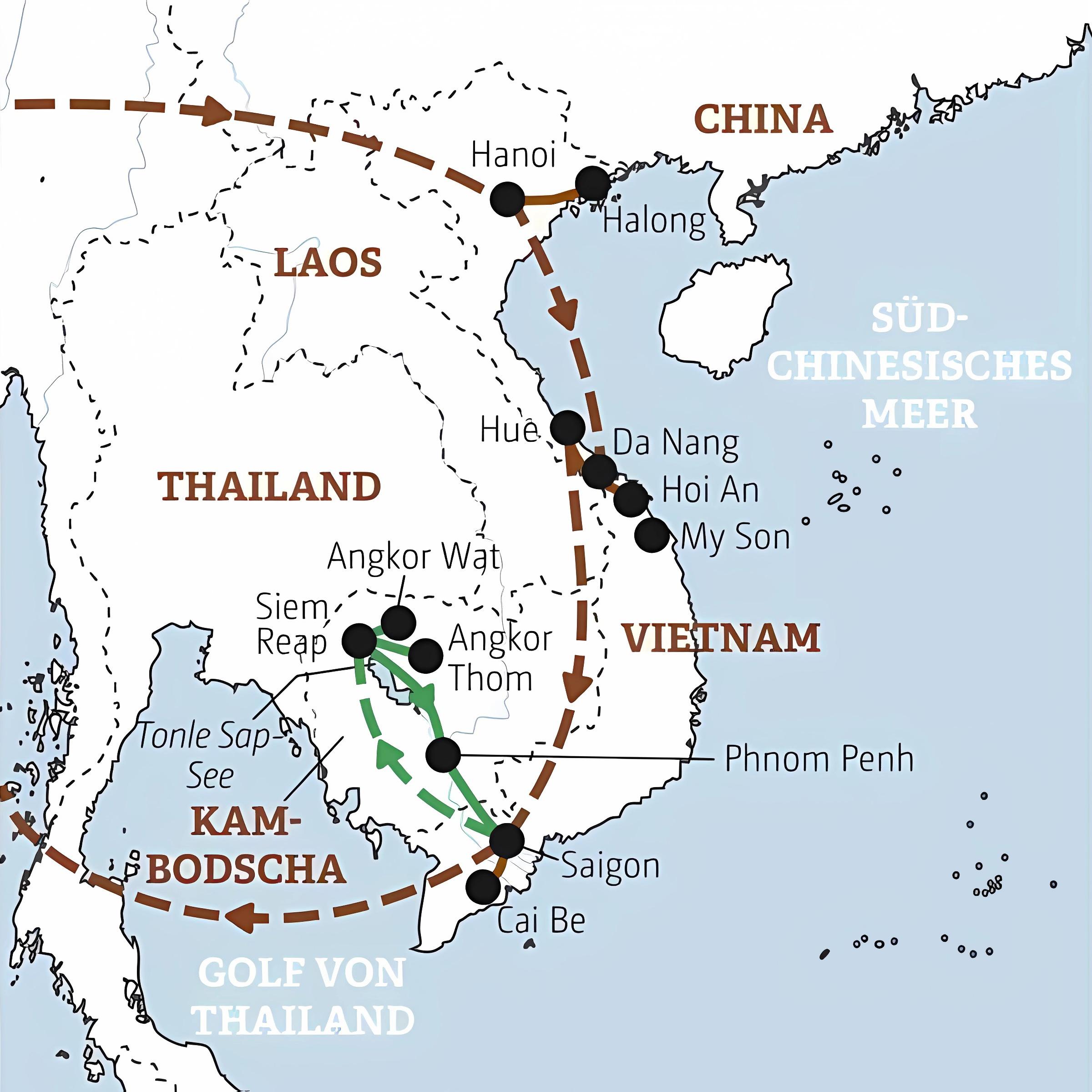 Fühlen Sie sich in der smaragdgrünen Halongbucht wie einer der Piraten, die hier früher zwischen den unzähligen Zauberfelsen und Höhlen Unterschlupf gesucht haben. Ein faszinierender Kontrast zu dieser bizarren Landschaft sind die Hightech-Fassaden und knatternden Mopeds in Saigon. Im Handelsstädtchen Hoi An bummeln Sie durch die Gassen der Schneider und Kunsthandwerker.